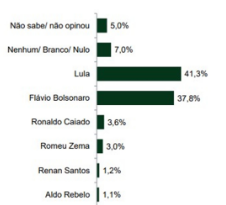 No cenário de 1º turno, Lula aparece com 41,3% das intenções de voto, enquanto Flávio tem 37,8%, configurando um empate técnico, já que a margem de erro é de 2,2 pontos percentuais. O governador de Goiás, Ronaldo Caiado (PSD), ficaria com 3,6% dos votos, seguido pelo ex-governador de Minas Gerais Romeu Zema (Novo), com 3%