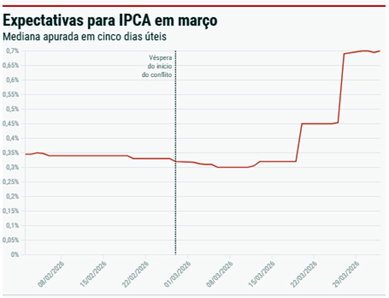 “Nossa expectativa de inflação é que, nos próximos números, apareçam de forma clara os resultados do conflito no Oriente Médio sobre os preços brasileiros, resultando em preços mais elevados – o que vai gerar um cenário desafiador para as expectativas de inflação do Banco Central, porque isso tem potencial para pressioná-las ainda mais”, indica Natalie Victal, economista-chefe da SulAmérica Investimentos.