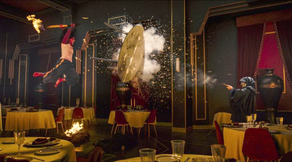 O que se vê deste momento em diante é um estiloso desfile de mutilações e mortes que vai dos básicos tiros no meio da fuça até eliminações bem mais criativas. A força com que alguns corpos são atirados para trás é exagerada, assim como os esguichos de sangue que se vê na tela. Esta estilização deixa o que poderia ser só uma festa de gore em algo divertido de se ver. No público, risos são muito mais frequentes do que caras de nojo e mãos nas frentes do rosto.