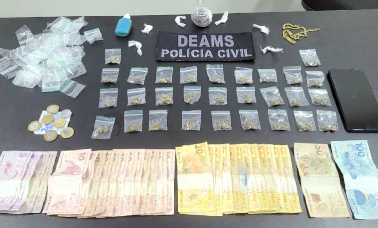 No momento da prisão, o investigado foi flagrado com porções de maconha, material para embalagem e dinheiro, resultando também em uma autuação em flagrante por tráfico de drogas.
