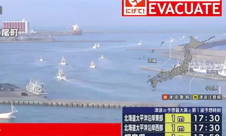 A emissora NHK exibiu navios deixando o porto de Hachinohe, em Hokkaido, em antecipação às ondas, enquanto um alerta “Tsunami! Evacuar!” piscava na tela.