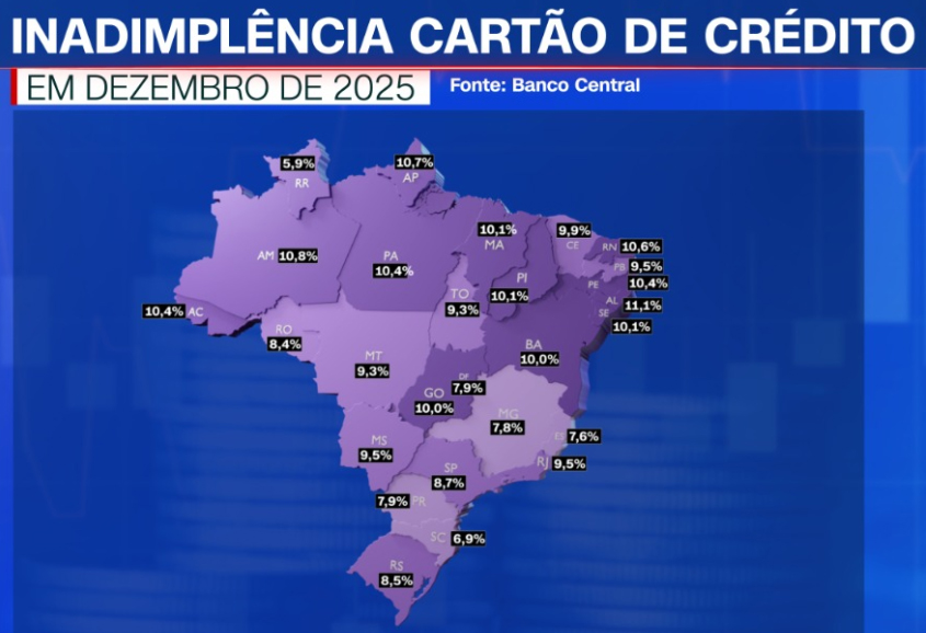 No recorte das dívidas não pagas nos cartões de crédito, o cenário é ainda mais drástico. Em estados como Maranhão, Pará, Amazonas e Goiás, o índice de inadimplência supera 10%.