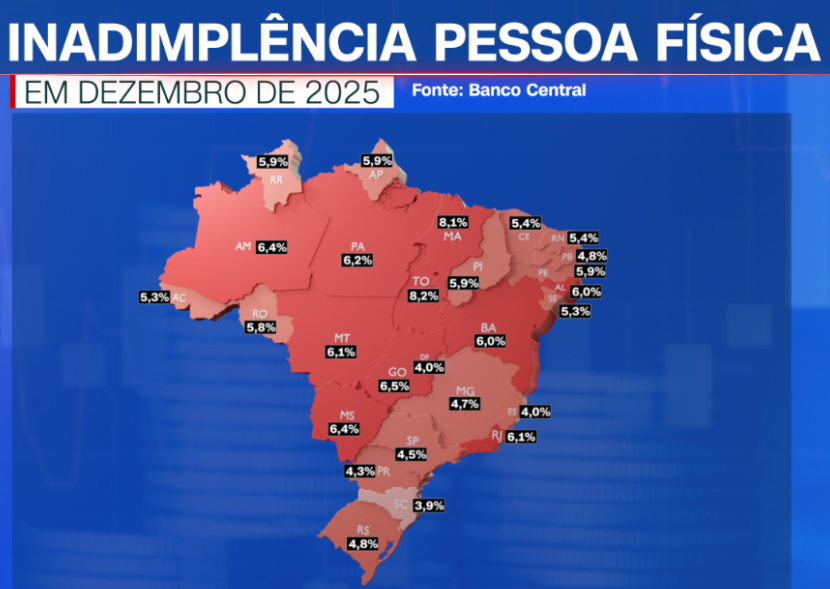 No mapa da inadimplência do Brasil, o estado do Tocantins registra a maior taxa do país, de 8,2%, segundo dados do BC (Banco Central) referentes a dezembro de 2025. Completam o pódio Goiânia, com taxa de inadimplência das pessoas físicas de 6,5%; e Amazonas, com 6,4%.
