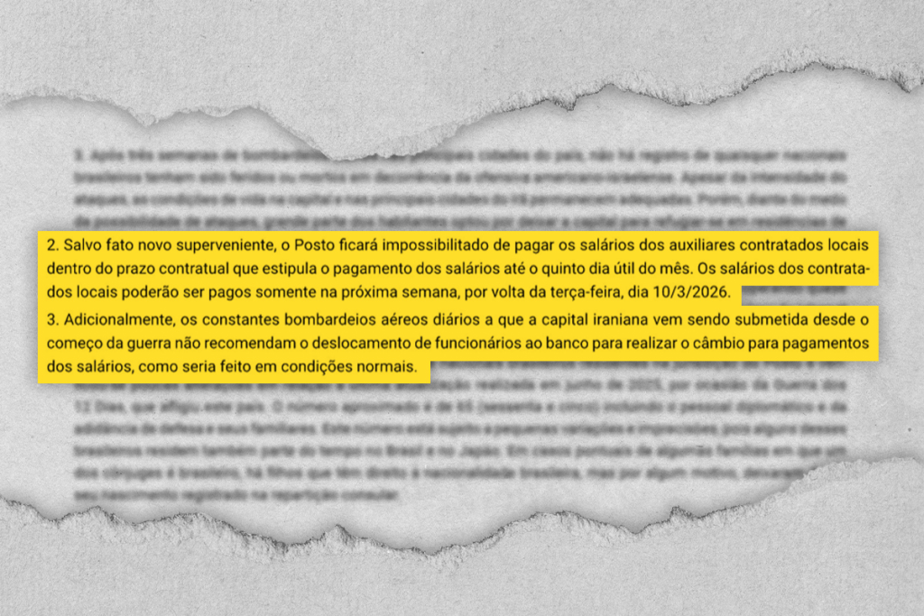 “Nessas condições muito agradeceria a Vossa Excelência o obséquio de considerar a possibilidade de, excepcionalmente, autorizar o pagamento imediato dos salários dos contratados locais referentes ao mês de fevereiro de 2026 em dólares norte-americanos, sem a realização de operação de câmbio”, disse um trecho do telegrama.